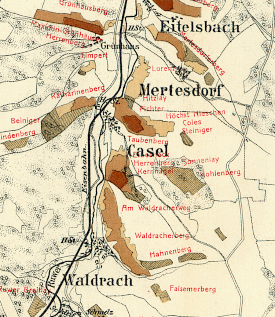Die Lage Kaseler Kehrnagel liegt in einem Seitental östlich der Ruwer. Die Reben wachsen hier auf Devon-Verwitterungsschiefer und tiefgründigem Boden.