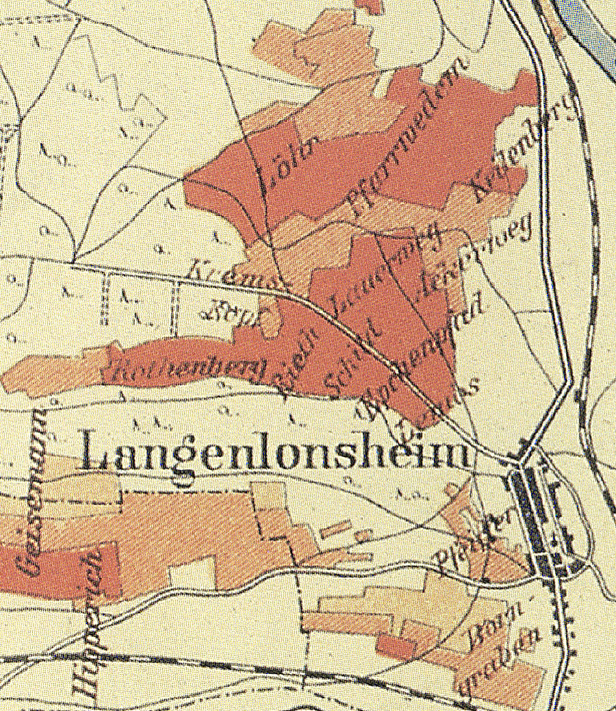 Zur LageWindgeschützt und gute Wasserversorgung sind weitere wichtige Merkmale. Vom Königsschild blickt man westlich auf Langenlonsheim, im Rücken hat man den direkt anschließenden Wald. Sanfte Hügel bestimmen ringsum die Landschaft um den Königsschild.