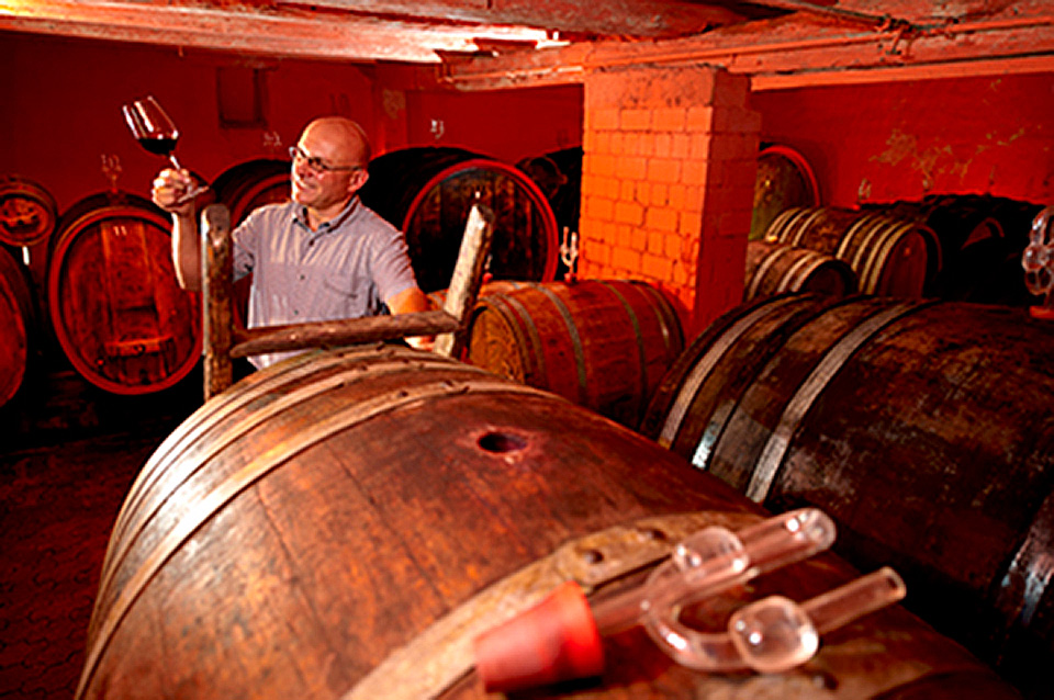 • Das Foto zeigt Lothar Schwörer im Barrique-Keller seines Weinguts.