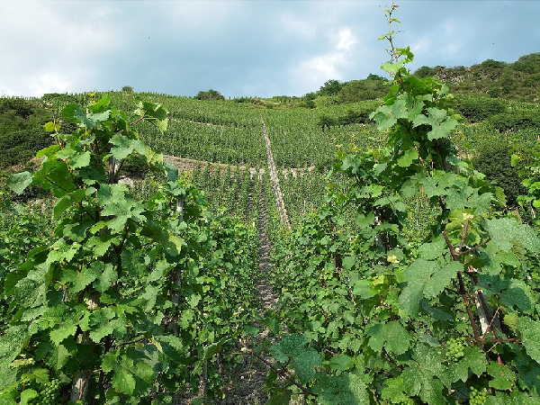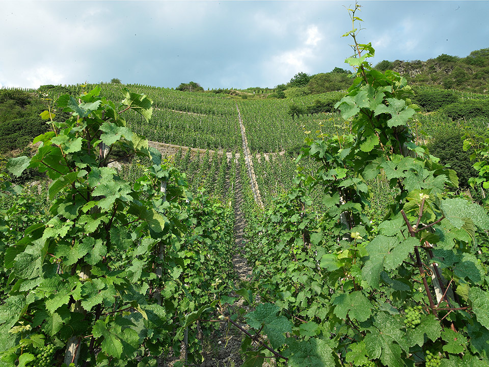 Das Gestein verwitterte in den gleißenden, vom Wasser reflektierten Strahlen der südlichen Sonne, aus Westen trocknete ihn der Wind. Heute markieren Trockenmauern, vor zwei Generationen kunstvoll errichtet,die besten Parzellen der „Laurentiuslay“, wachsen an wurzelechten Reben, oft ebenso alt, Trauben, in deren Saft sich alle Kräfte der Elemente zu einem rassigen Wein vermählen: Rieslinge, warm wie die Luft, glänzend wie das Licht, schmelzend wie der Stein.