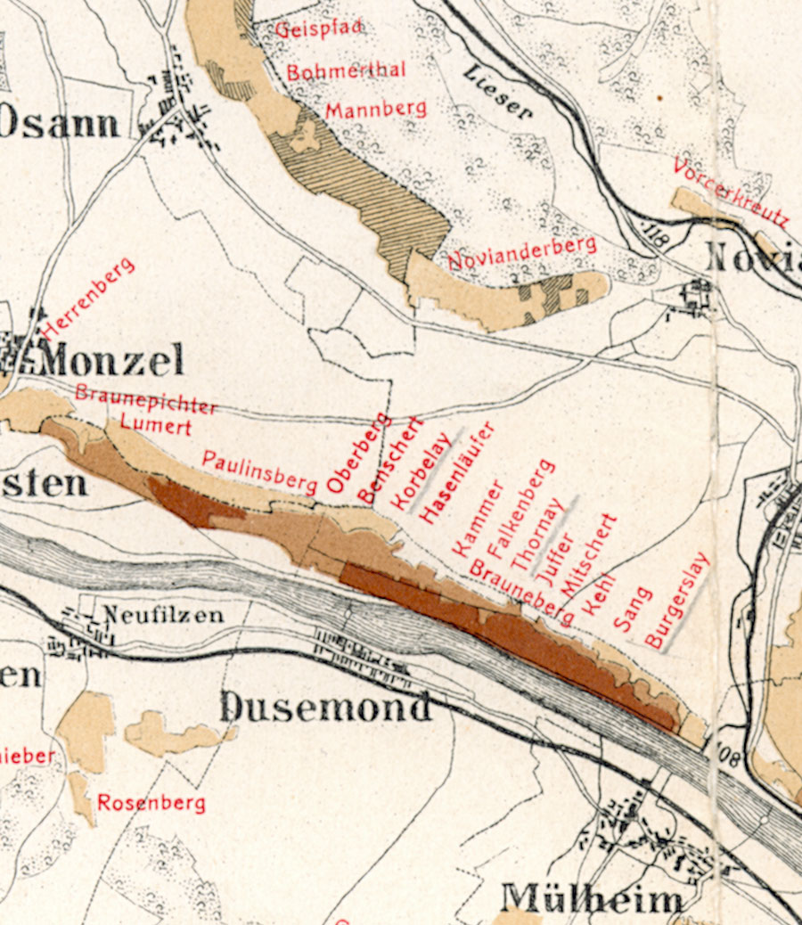 Das am Kamm sich anfügende Plateau versorgt die als Wärmekessel geformte Lage mit ausreichend Wasser. Dieses Kleinklima ist Garant für eine hohe Ausreifung der Trauben und ideal für edelsüße Gewächse. Ganz oben vom Plateau aus, haftet der Blick auf der mächtigen Kirche in Lieser, schweift über die Mosel und gegenüber bis zum Ort Mülheim.