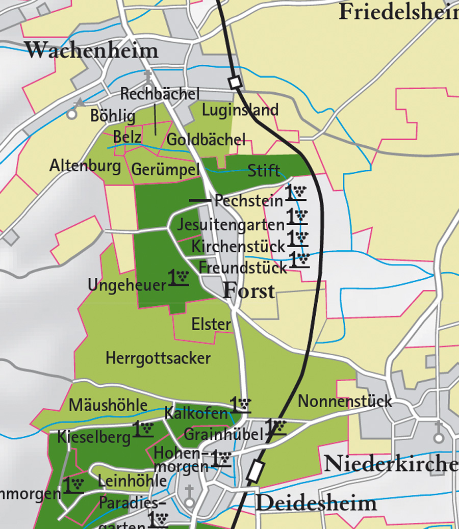 Die Abbildung zeigt den Ort forst mit seinen Ersten Lagen. Ausschnitt aus dem Weinatlas Deutschland. Stand 2009. © Kartografie: Weinatlas Deutschland, HALLWAG Verlag