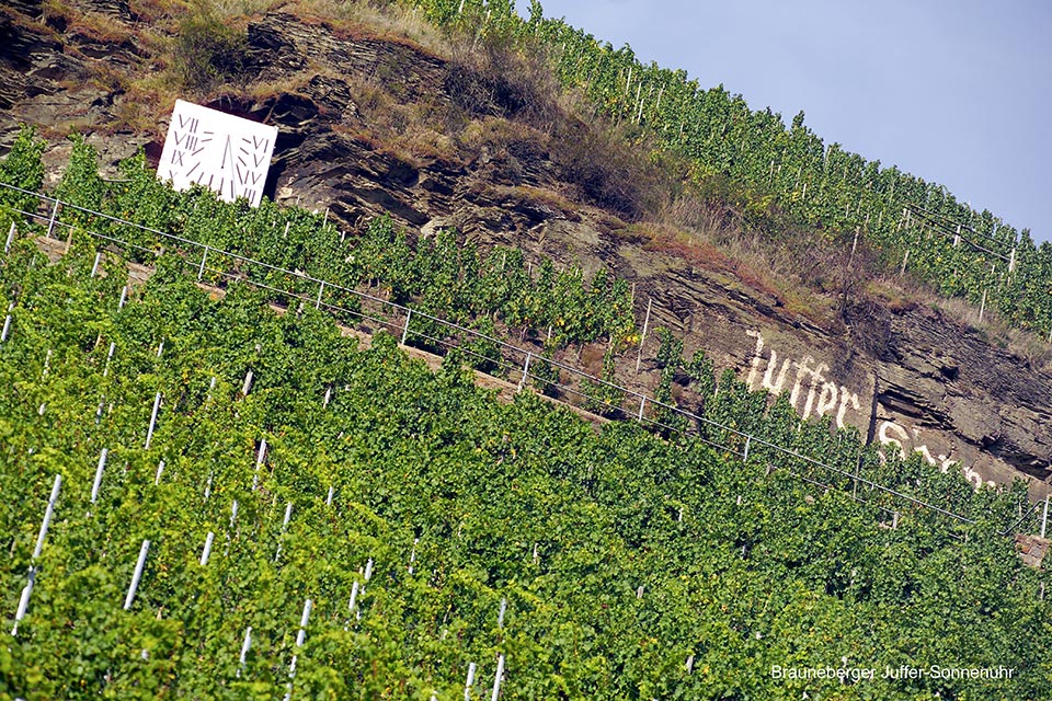 Herzstück des Braunebergs ist die Juffer Sonnenuhr. Die zweite Namenshälfte dieser Steillage rührt von der Sonnenuhr her, inmitten des Weinbergs.
