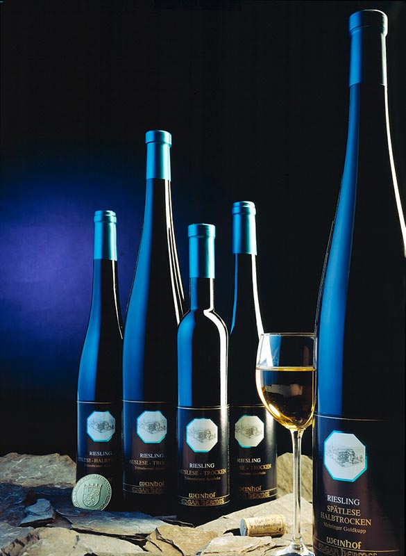 • Das Foto zeigt Flaschen aus dem Sortiment von Weinhof Edgar Hermes, Trittenheim.